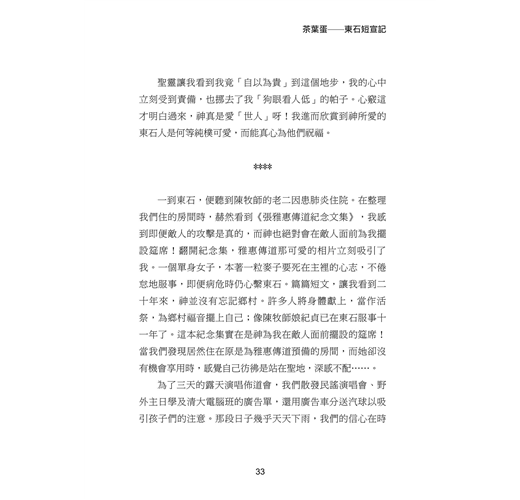一到東石,便聽到陳牧師的老二因患肺炎住院。在整理我們住的房間時,赫然看到《張雅惠傳道紀念文集》,我感到即便敵人的攻擊是真的,而神也絕對會在敵人面前為我擺設筵席!翻開紀念集,雅惠傳道那可愛的相片立刻吸引了我。一個單身女子,本著一粒麥子要死在主裡的心志,不倦怠地服事,即便病危時仍心繫東石。篇篇短文,讓我看到二十年來,神並沒有忘記鄉村。許多人將身體獻上,當作活祭,為鄉村福音擺上自己;像陳牧師娘紀貞已在東石服事十一年了。這本紀念集實在是神為我在敵人面前擺設的筵席!當我們發現居然住在原是為雅惠傳道預備的房間,而她卻沒有機會享用時,感覺自己彷彿是站在聖地,深感不配……。