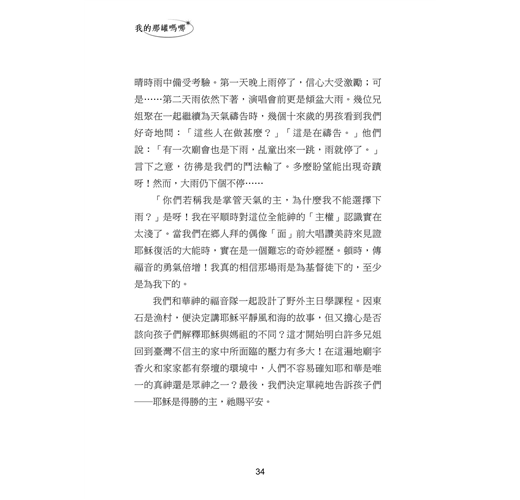 「你們若稱我是掌管天氣的主,為什麼我不能選擇下雨?」是呀!我在平順時對這位全能神的「主權」認識實在太淺了。當我們在鄉人拜的偶像「面」前大唱讚美詩來見證耶穌復活的大能時,實在是一個難忘的奇妙經歷。頓時,傳福音的勇氣倍增!我真的相信那場雨是為基督徒下的,至少是為我下的。