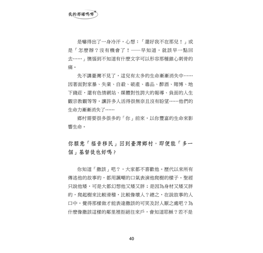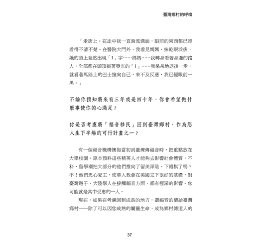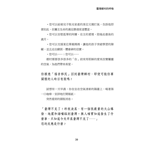 你是否考慮將「福音移民」回到臺灣鄉村,作為您人生下半場的可行計畫之一?