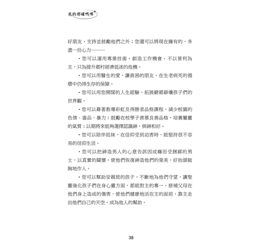 在本書一篇見證中,她回憶「常覺得有聖靈同在,祂給我靈感,不僅梳理我的思緒,藉著四周環境的人和事提供我資料,讓我對所寫的內容,有較深刻的體會。特別是詞窮時,祂會給我適當的詞句,那種與主同工的喜樂,真是不可言喻,反而連家事都不嫌煩了。」