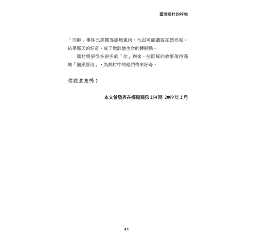 鄉村需要很多很多的「你」到來,把耶穌的故事傳得滿城「靈風恩雨」,為鄉村中的他們帶來好奇。