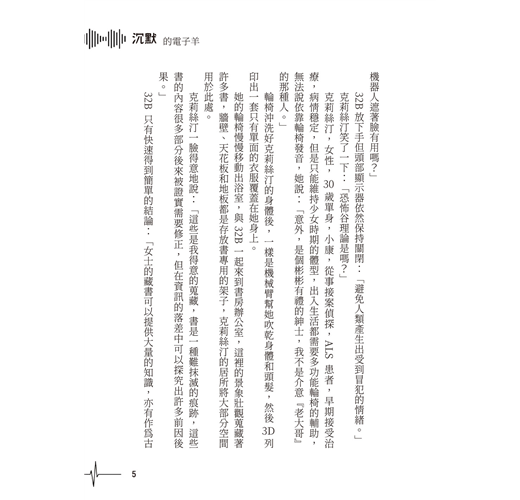 主角克莉絲汀,一名身患ALS、全身仰賴智慧輪椅維生的女偵探,