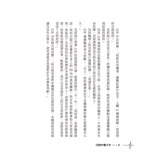 克莉絲汀看著32B的頭部顯示器,認真的說出一字一句:「我知道,我靠輪椅說話,我的衣服只是覆蓋在身上的3D列印透氣纖維,我在外面移動會給大家造成麻煩,我能活下去是因為社會耗費許多資源在我身上,這就是為什麼我會成為接案偵探,如果能回報這個社會一點點幫助,我可以忍受那些人的目光和批評,這就是我希望活下去的原因。」