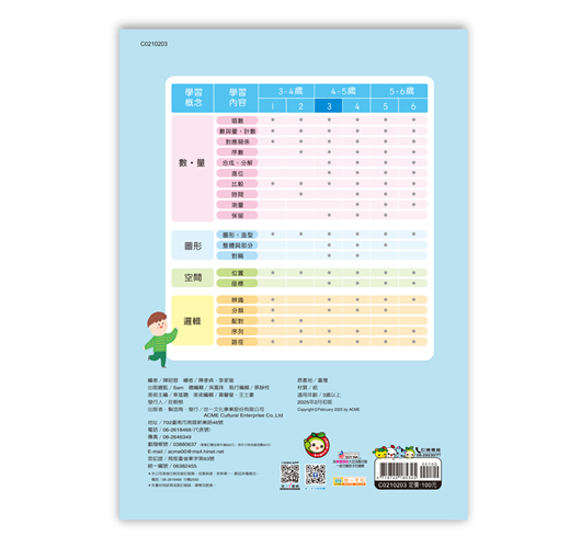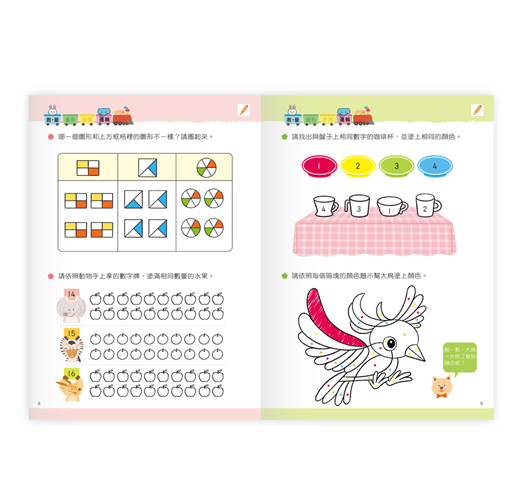 運用螺旋式教學法,循序漸進的規劃,引導幼兒建立數與量,空間,圖形和邏輯 概念,並搭配豐富的題型以培養幼兒對數學的興趣.