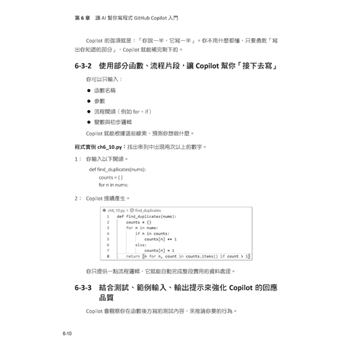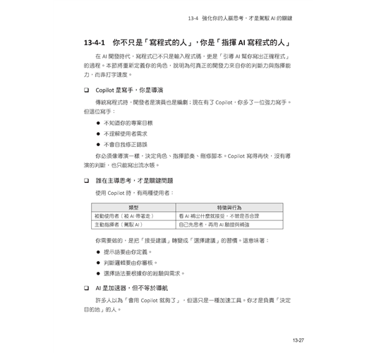 GitHub Copilot 能幫你寫程式,但本書更強調「思維升級」——如何正確下指令、判斷 AI 建議的正確性,培養「指揮 AI」的能力,避免淪為被動依賴。