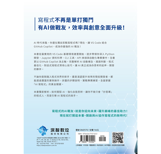 ★★★「專案實戰,立即上手,程式設計不再卡關!」★★★《寫程式的AI戰友 - VS Code x GitHub Copilot》帶你進入 AI 輔助程式設計的新世代。本書不僅教你如何用 VS Code 打造專屬開發環境,更完整揭示 GitHub Copilot 的秘密武器:自動補全、錯誤修正、重構優化、AI 對話寫程式,讓你像專業工程師一樣高效開發。