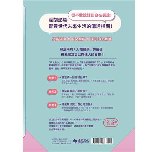 「身為一個國中輔導主任,在輔導室裡,我陪伴過許多孩子,他們在人際關係中跌跌撞撞,有時不懂如何表達自己,有時只是渴望一句被理解被接納的回應。這套《在長大路上,真正理解自己與他人》系列書,正是孩子探索情緒、理解自我與他人的一盞燈。它貼近生活,溫柔而真實,是SEL社會情緒學習最美的延伸。推薦給每位想用愛陪伴孩子成長的師長與家長,願我們一起守護孩子的心,陪他們走出一條充滿理解與連結的成長之路!」──臺北市立古亭國民中學輔導主任 王培玲