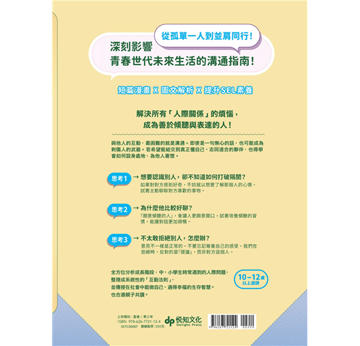 「身為一個國中輔導主任,在輔導室裡,我陪伴過許多孩子,他們在人際關係中跌跌撞撞,有時不懂如何表達自己,有時只是渴望一句被理解被接納的回應。這套《在長大路上,真正理解自己與他人》系列書,正是孩子探索情緒、理解自我與他人的一盞燈。它貼近生活,溫柔而真實,是SEL社會情緒學習最美的延伸。推薦給每位想用愛陪伴孩子成長的師長與家長,願我們一起守護孩子的心,陪他們走出一條充滿理解與連結的成長之路!」──臺北市立古亭國民中學輔導主任 王培玲