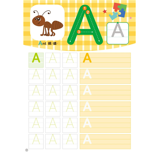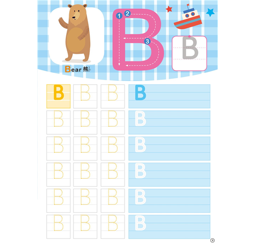 提供清楚的筆劃與筆順示範,孩子能一步步描寫練習,建立正確的字母書寫觀念。