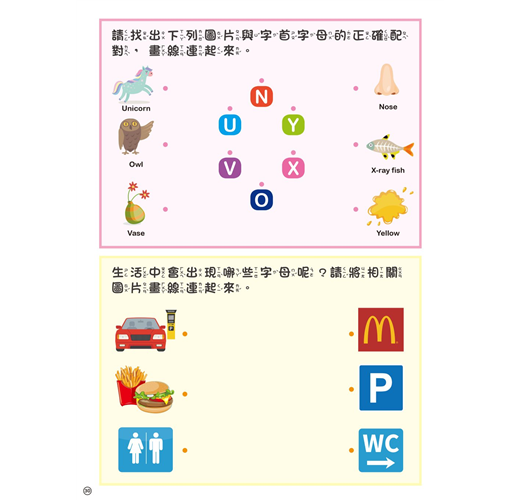 每個字母搭配常見單字與生動插圖,幫助孩子將字母與單字建立聯結,增加詞彙量。