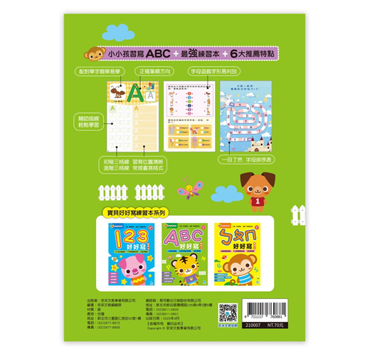 本書特別針對3~7歲幼兒設計,從基本筆順、清楚字形,到反覆書寫練習,讓孩子在輕鬆有趣的過程中,把字母寫得正確又漂亮。書中穿插配對、迷宮等趣味小遊戲,讓孩子在玩樂中不知不覺加強字母的辨識與應用能力。