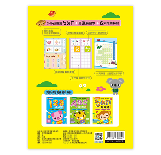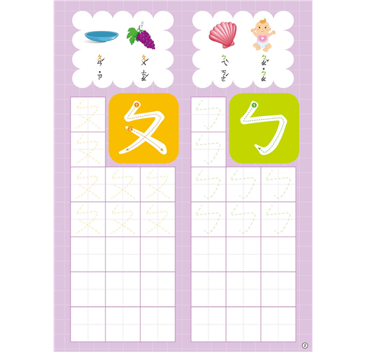 本書特別針對3~7歲幼兒設計,從基本筆順、清楚字形,到反覆書寫練習,讓孩子在輕鬆有趣的過程中,把ㄅㄆㄇ寫得正確又漂亮。書中穿插配對、迷宮、著色等趣味小遊戲,讓孩子在玩樂中不知不覺加強ㄅㄆㄇ的辨識與應用能力。