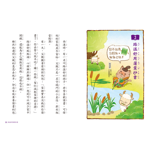 不過,一個肯努力,知道上進的人,是不會被環境打敗的。有一天,他在放羊的地方看到水澤邊長滿了蒲草,突然靈機一動,心想:「不如就用這些蒲葉來寫字吧!」