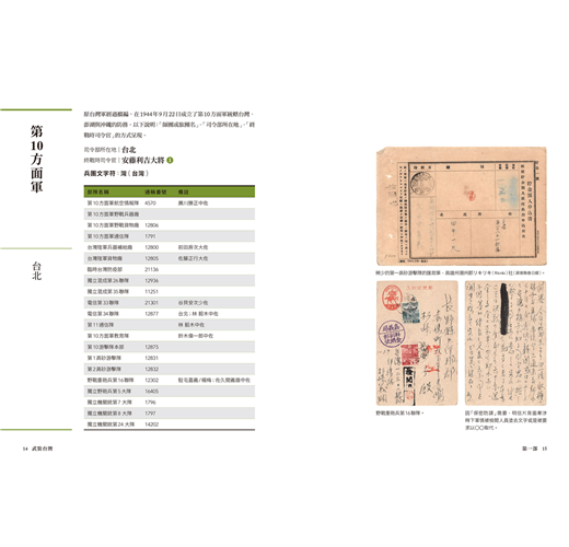 4. 彙整終戰前日軍駐台各地部隊與通稱號,搭配軍郵與徵兵文書等珍貴史料。