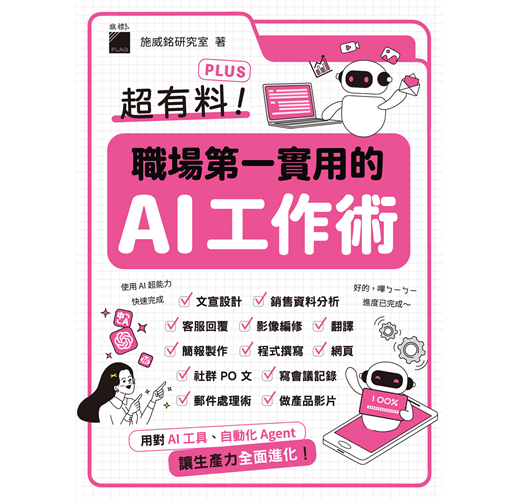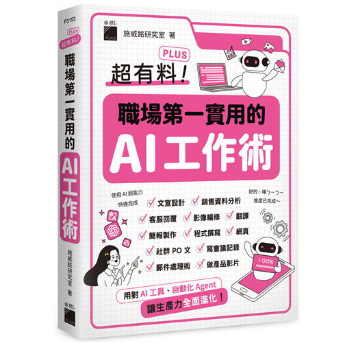 AI 進化速度驚人, 除了 ChatGPT 外, 還有超級多 AI 工具問世, 但要如何活用種種工具, 絕對是一項大挑戰。市面上雖然有不少 AI 職場、AI 工具書, 但不少只教工具介面操作, 範例也不夠職場面, 很容易用到最後不知道這些 AI 要用在哪裡而晾在一旁...