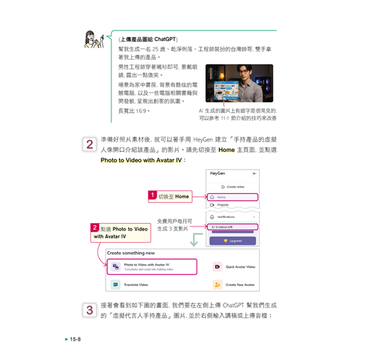 老話一句, 【別忘了我們有 AI 啊~~】, 當遇到這種情況, 我們會示範如何利用 ChatGPT 等 AI 聊天機器人幫我們解決用其他 AI 所遇到的問題。例如不少 AI 工具需要一長~~串英文提示語來運作 (想到就暈), 此時就可以請 ChatGPT 幫我們擬內容, 畢竟我們是要用 AI, 不是來練英文的 :)。一大堆 AI 工具就擺在那, 該如何組合運用才能對工作有幫助, 本書會有完整的示範。