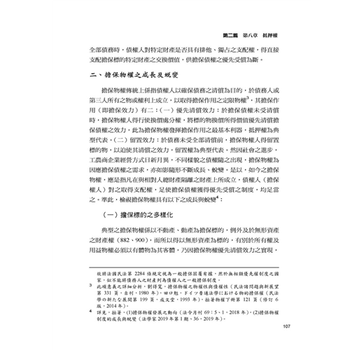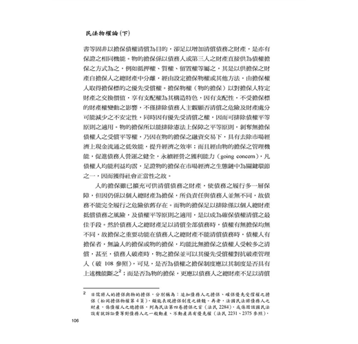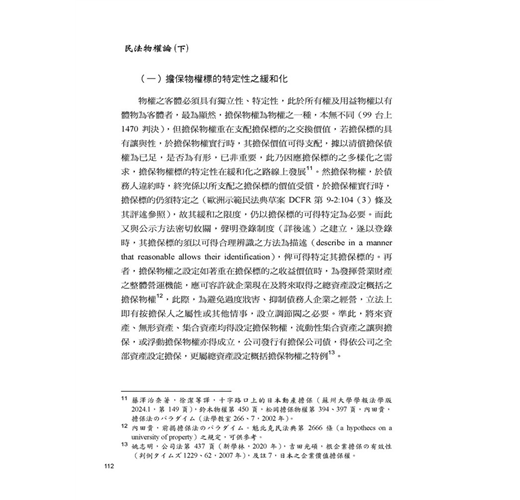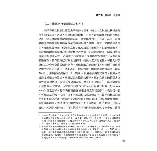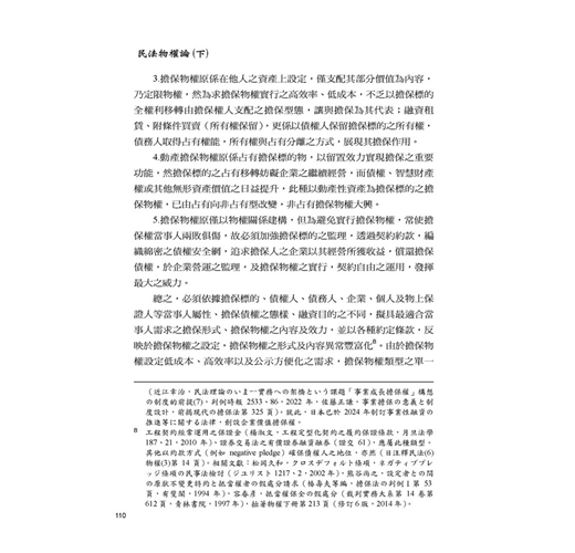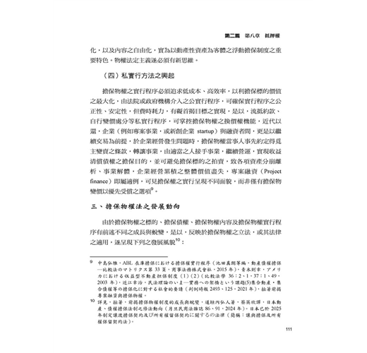 三、最高限額抵押權應是我國擔保物權運用之大宗,而共同最高限額抵押權為其中所最常見,又因最高限額抵押權必有最高限額,最高限額成為扮演限定共同抵押權之各抵押物負擔金額之作用,形成共同抵押權均有限定抵押物負擔金額之特殊景致,實為意料之外。共同最高限額抵押權於學說上有純粹共同最高限額抵押權與非純粹共同最高限額抵押權之分,非純粹共同最高限額抵押權有無共同抵押權規定之準用,民法規定並非明確,實務遂生困擾,至今似尚未形成共識,對此困擾,本書亦於不影響共最高限額抵押權之優先受償利益範圍內努力尋求利益衡平之解方。再者,世界銀行每年公布之經商環境報告書,日本評價甚低,其中「授與信用」乃關鍵之負面因素,為茲因應,日本已於2024年、2025年先後制定推進事業性融資法、讓與擔保契約及所有權保留法,前者,創設企業價值擔保權,以利獨角獸企業之融資,後者,使習慣與判例法形成之讓與擔保,安定化及明確化,積極優化企業投資及擔保環境,令人艷羨,誠足為我國集合財產讓與擔保健全化及現代化之借鏡。