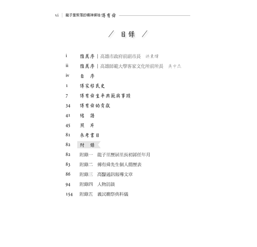 傅有舜是龍子里聚落活動中心的創辦人,且一生為客家無私奉獻,此書《龍子里聚落的精神領袖:傅有舜》即為介紹傅有舜的生平至如何成為人人景仰的高雄客家大佬,雖然已仙逝,其客家刻苦耐勞、硬頸精神,永植後生人心中。