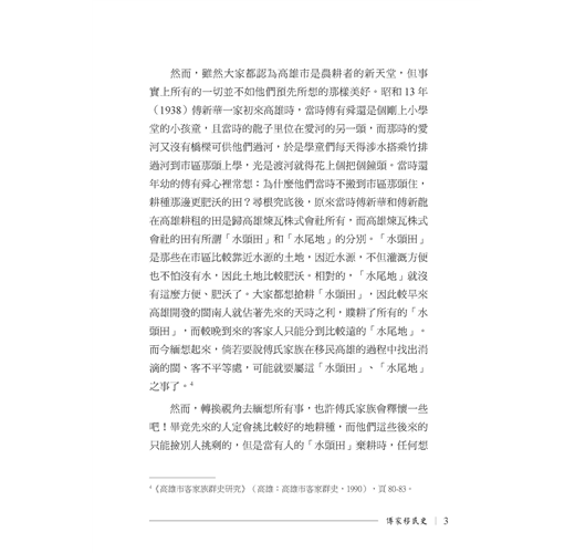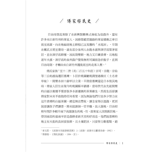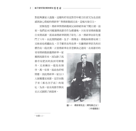 傅氏家族2 至十二世(約二百五十年前)宗可、宗龍、宗佑等三公始渡海遷居臺灣,卜居於桃園廳桃澗堡過嶺庄(土名青草坡),開墾水田十餘甲以立業。早期當臺灣還是日本殖民地時,傅家人居住在現今的桃園縣平鎮鄉,當時世代在先祖開墾的山區以栽種不需要很多水源灌溉的茶葉維生。然而生活卻讓傅家對未來不敢抱持任何希望,因為無論他們付出多少努力在這片貧瘠的山區茶園,總是無法豐收,讓全家得以溫飽,更別說要讓孩子們讀書,將來能謀個一官半職、出人頭地。日治昭和年間許多較早南下高雄謀生的桃、竹、苗客家人回到舊居地,帶回南部的嘉南平原是農耕者新天堂的好消息,他們說那裡的地主有大批的良田要放耕,且土壤肥沃,只要努力勤奮點,絕對能夠讓家人溫飽。這樣的好消息對仍年輕力壯卻又為生活而感到身心俱疲的傅新華3 與傅新龍兩兄弟,是極大吸引力。