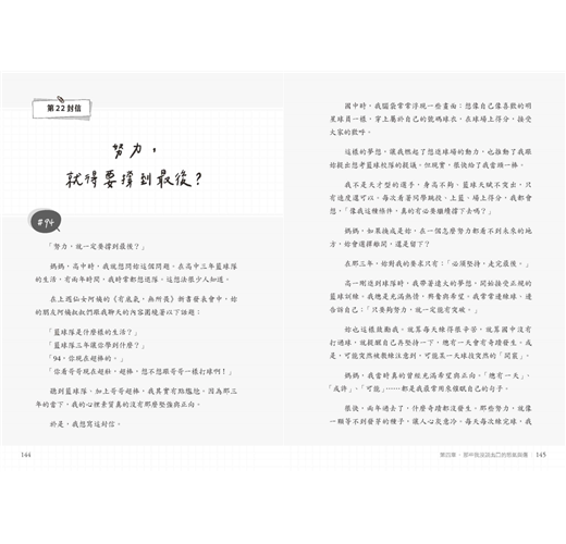 到了高中,因為加入球隊必須住宿,我大部分的時間都不在家,即便家很近也無法常常回去。高一、高二時,我也經歷了許多挫折,妳不在我身邊,想必更加操心、更加無力吧!這時候,旁人可能會覺得,比起待在家裡、學業不需要妳操心的姐姐,妳更把重心放在我身上。我知道我讓妳頭痛、煩惱、擔心的次數遠遠多於姐姐,甚至讓妳為了我而去改變自己以往的習慣和想法。但其他人不知道的是,如果妳那時候沒有把重心放在我身上,哪怕只是一小段時間,我可能現在就不會是「這個樣子」了。
