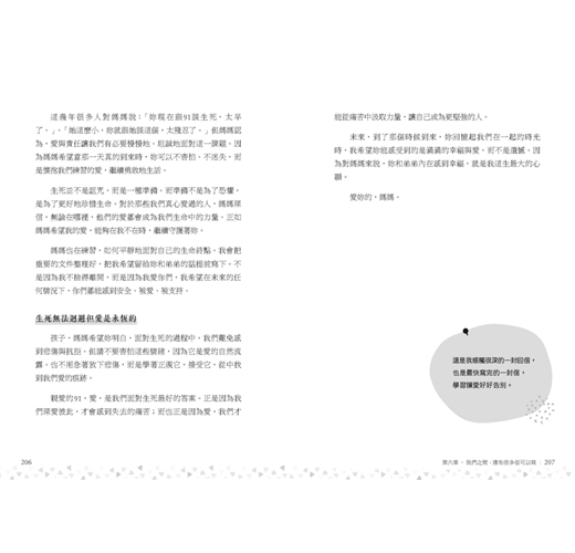 能和這樣的媽媽一起成長,是一件很幸福的事。雖然我也曾猶豫,自己的經歷能帶給別人什麼?但有一位長輩曾堅定對我說:「世界上一定有一個孩子跟妳一樣,而妳的經驗能幫助他相信自己。」