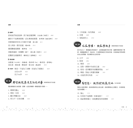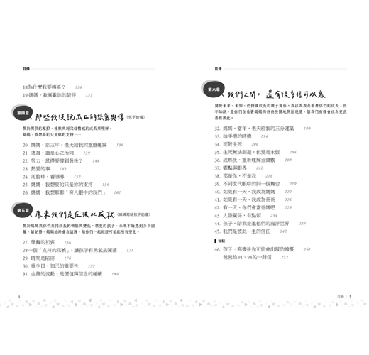 朋友常說,我是一個「孩子都已經成年,還願意與媽媽出雙入對」的母親。無論演講、旅行、活動分享,我的孩子總願意跟著我一起參與,而我也總會放下身分,成為他們的觀眾、支持者、陪伴者。這不是天生的默契,而是彼此一次次的願意靠近、願意理解、願意爭執後,再回頭說「對不起」所練習而來的。所以這本書,不只是給我們自己,也想給那些在親子關係中,常感到疑惑、不知所措的父母們;以及給那些在成長過程中,覺得跟父母很難說話的孩子們。