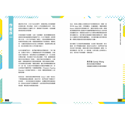 在此,我衷心感謝丈夫與兩位孩子的理解與支持。感謝一直同行的 Astor 姑娘、王珮瑤醫生、杜蘊瑜醫生、職業治療師Karen 姑娘的信任與專業合作,讓這本書得以成真。感謝香港營養師界熱心服務多年的顧問營養師林思為女士對本書的鼓勵與支持。感謝我在香港中文大學時的導師兼食物科學家朱建勤先生,為本書內的食譜進行專業的營養分析。感謝在公立醫院合作無間的顧問醫生、兒科專科醫生對本書的推薦。感謝在英國的朋友協助食譜相片拍攝。