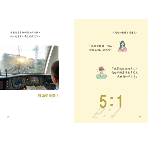 再例如:一列失控的電車正朝五個人衝過去,而你站在可以轉換軌道的拉桿旁。如果你什麼都不做,電車會撞死五個人;如果你拉下拉桿,電車會轉向另一條軌道,但那裡有一個人。你會怎麼做?有人覺得應該救更多人,所以會拉下拉桿;有人覺得主動改變軌道,等於親手造成一個人的死亡,所以寧可不動。這個問題沒有唯一正確答案,卻能讓我們看見,道德選擇往往不是「簡單的數學題」,而是「艱難的抉擇」。