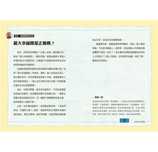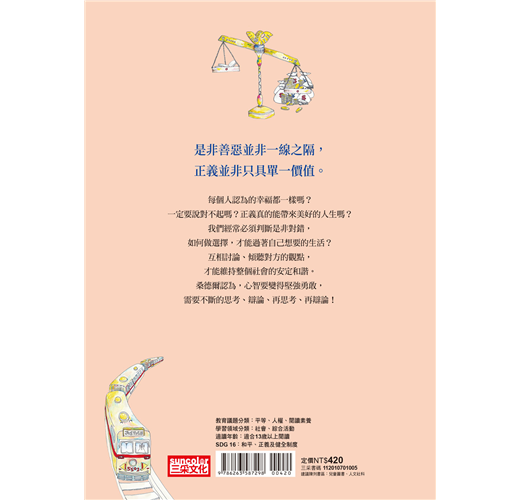 ◎正義,不只是找到答案,而是一段持續的探索旅程。在閱讀這本書的過程中,你或許會發現,有些問題永遠沒有唯一解答,但這並不代表思考是沒有意義的。相反的,正是因為這些難題,我們才有機會真正看見彼此的不同,並找到更深的理解。因為唯有透過這樣的過程,我們才有機會達成「共善」,一個能讓大多數人安心、互相尊重、彼此共存的社會。──吳明潔/國立陽明交通大學附屬竹北高級中等學校公民科教師