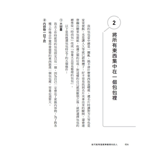 我的包包當中總是一團亂。搞不清什麼東西放進哪裡,遞名片時讓對方久等也是家常便飯。光是讓人久等就已經夠糟了,好不容易找到名片夾拿出來的瞬間,還會連帶蹦出糖果包裝紙、收據之類的垃圾。對這樣的自己感到厭煩之後,就把選擇包包的標準從「時尚包」改成「容量大且容易整理的包包」。