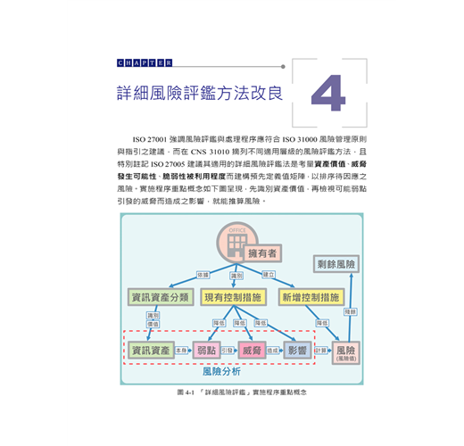 本書提供相當多值得機關參考的資安管理策略與實務,首先我特別注意到資訊資產盤點、風險評鑑的建議方案,介紹基於ISO 27005、ISO 31010的高階風險評鑑方法,並參考國家資通安全研究院相關建議,提供一套完整的檢核表格與執行程序,不僅涵蓋系統分級,更將高階風險評鑑視為必須檢核防護基準的重要手段,納入安全控制措施的改良做法。另外,基於ISO 27001、ISO 31000、ISO 27005,詳細闡述如何進行詳細風險評鑑,針對威脅與弱點的識別,提供詳細的威脅目錄清單與控制措施識別清單,有效引導資訊資產管理者全面考量並確保評估的完整性。這些設計不僅簡化複雜的評估過程,還提供明確的引導方式,以及程序書參考條文,對於各機關落實資訊資產與資通系統風險評估合規,提供絕佳的參考方案與最佳實務。