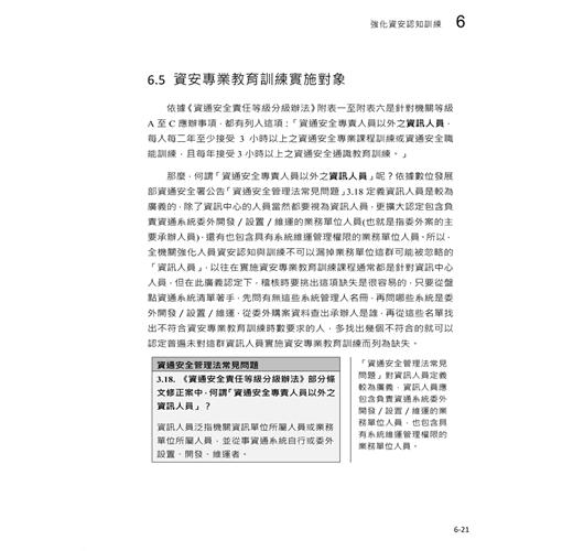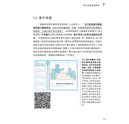 本書也深入探討委外執行的法遵面要求,提供從考量、選任到監督的完整過程詳細指導,提醒委外人員在各階段應有的資安管理作為,並開放使用的教育訓練簡報,為各機關在這方面提供很好的教育宣導素材。而委外資通系統廠商須知的內容,不僅是委外廠商,更是各機關系統開發人員相當值得深入研讀的詳盡指引,強調達成資通系統防護基準的技術要求,將國家資通安全研究院的安全控制措施參考指引、美國國家標準及科技研究所頒布的NIST SP800-53安全控制措施進行深入淺出的探討,系統開發人員熟讀此章內容便能確保開發出的系統符合防護基準要求。