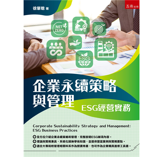 本書整合學術研究與實務應用,適合大專院校管理相關科系課程採用。內容包含高階的企業策略、國際永續趨勢與管理導論、以ESG架構說明公司治理面與風險管理、企業社會責任、綠色法規與標準、相關系統認證與管理等。透過本書,讀者可了解ESG理論與案例,並能進一步思考如何進行轉型規劃與創造綠色商機,以達成企業永續發展的目標。