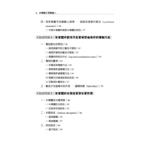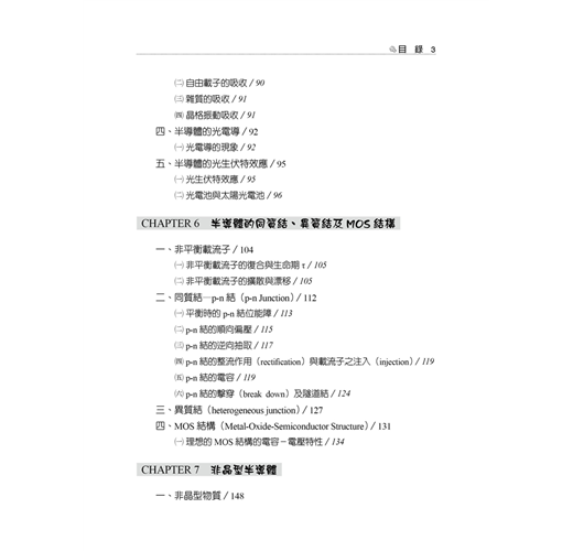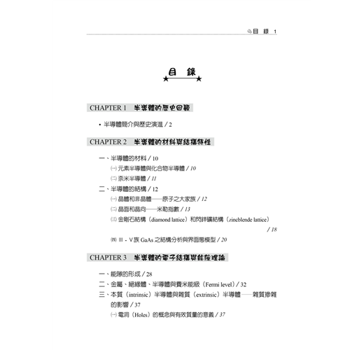 內容可分為十個章節:第一至第五章涵蓋目前主流半導體元件基本特性,包括了材料、結構、電磁場中的傳輸行為以及光電特性。第六至第八章探討現代與先進的元件物理之原理及相關應用,包括了MOS結構、非晶型半導體以及半導體多層結構。第九至第十章則討論以半導體元件為主的相關半導體製程與應用,包括了半導體長晶、長膜以及元件製程。