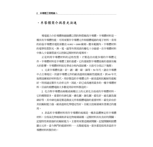 本書以有系統的方式,深入淺出地介紹目前半導體歷史回顧、物理及元件物理與製程整合所必須具備的基礎理論、重要觀念與方法、以及先進製造技術特別是奈米材料在最近發展快速之後,半導體的應用更加朝向奈米級的應用。內容可分為十個章節:第一至第五章涵蓋目前主流半導體元件基本特性、包括了材料、結構、電磁場中的傳輸行為、以及光電特性。第六至第八章探討現代與先進的元件物理之原理及相關應用、包括了MOS結構、非晶型半導體、以及半導體多層結構。第九至第十章則討論以半導體元件為主的相關半導體製程與應用,包括了半導體長晶、長膜、...