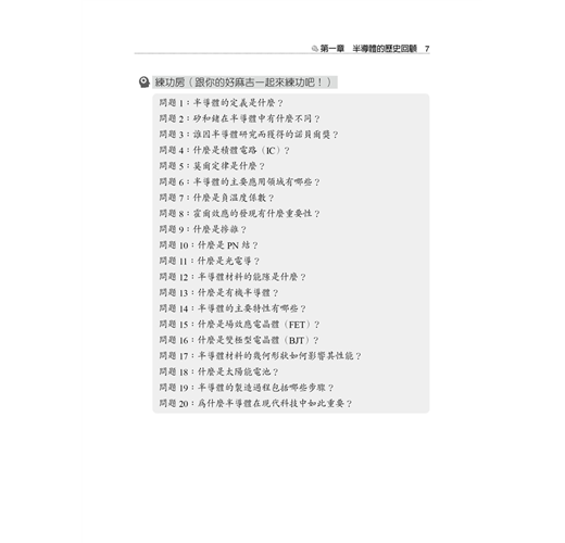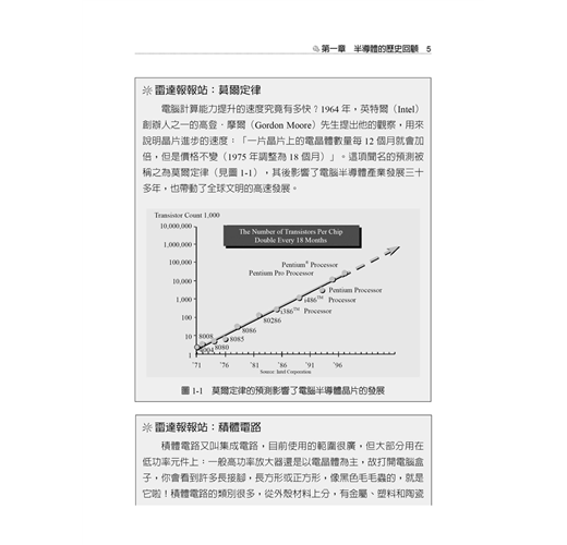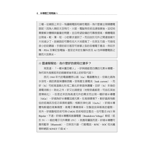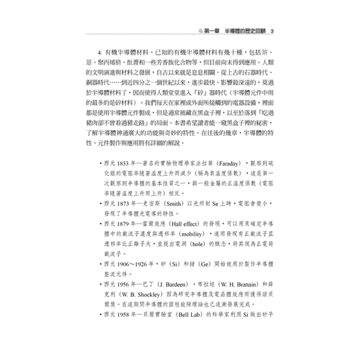 本書以有系統的方式,深入淺出地介紹目前半導體歷史回顧、物理及元件物理與製程整合所必須具備的基礎理論、重要觀念與方法、以及先進製造技術特別是奈米材料在最近發展快速之後,半導體的應用更加朝向奈米級的應用。內容可分為十個章節:第一至第五章涵蓋目前主流半導體元件基本特性、包括了材料、結構、電磁場中的傳輸行為、以及光電特性。第六至第八章探討現代與先進的元件物理之原理及相關應用、包括了MOS結構、非晶型半導體、以及半導體多層結構。第九至第十章則討論以半導體元件為主的相關半導體製程與應用,包括了半導體長晶、長膜、以及元件製程。由於強調基本物理觀念與實用並重,且對於重要的觀念或關鍵技術均會清楚地交代,並盡可能以「雷達報報站」的補充解釋來幫助讀者理解與想像,以期收事半功倍之效。