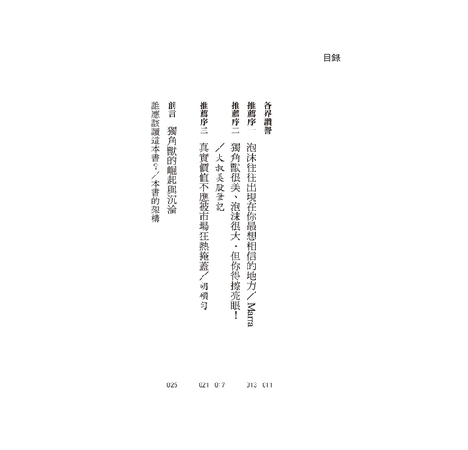 作者以敏銳的洞察力和深入淺出的筆觸,剖析了獨角獸企業誕生的內在邏輯,與短期大幅估值膨脹的現象。他將市場炒作與財務基本面的矛盾、風險投資與落實價值創造的張力,表現得淋漓盡致,使讀者能在閱讀後,重新審視那些輕率追逐市場熱潮背後所隱藏的風險。