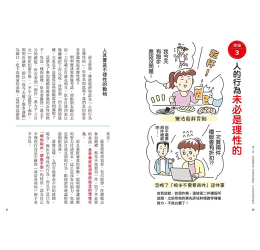 像這樣,人們可能會在不同的時間、場合,做出不理性的行為。而且不是只有「明知如此,卻做不到」的情況,認為自己不理性行為是正確的(或是有利的)例子其實也不少見。