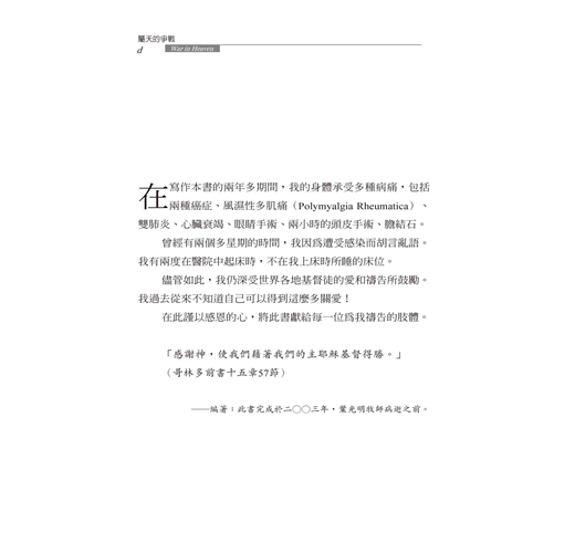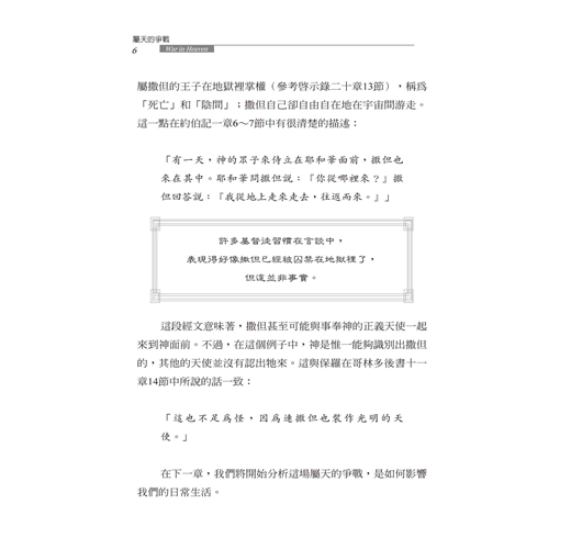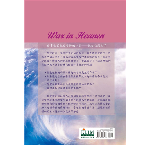 作者葉光明是一位有深入洞見的聖經教師,他以引人入勝的方式探索聖經,陳明上述以及其他的諸多問題。他帶領我們一窺亞當受造之前所發生的事件,同時也生動描述了耶穌勝過撒但那無與倫比的勝利。但事情尚未結束,現今正是神的子民加入這場爭戰的最好時刻!拿起你的屬靈兵器,跟隨那位榮耀的君王。平安和確信正等著你!