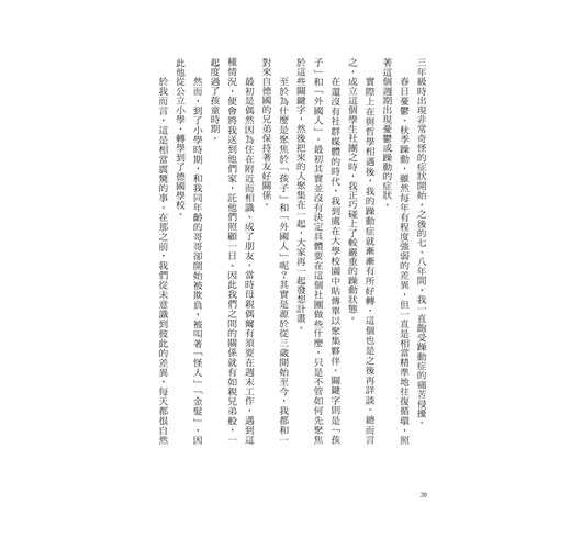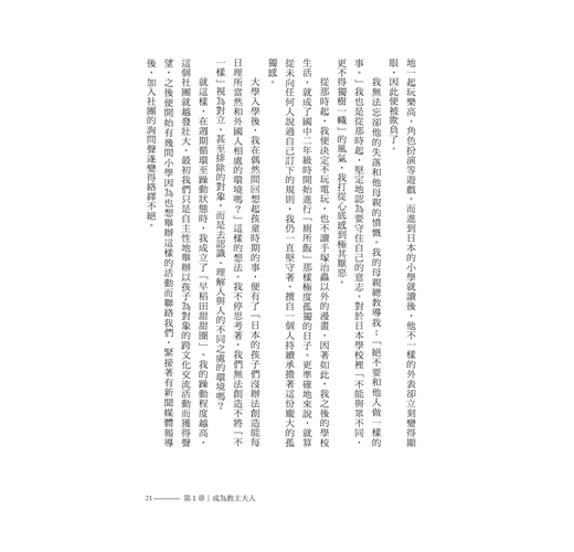 我無法忘卻他的失落和他母親的憤慨。我的母親總教導我:「絕不要和他人做一樣的事。」我也是從那時起,堅定地認為要守住自己的意志。對於日本學校裡「不能與眾不同,更不得獨樹一幟」的風氣,我打從心底感到極其厭惡。