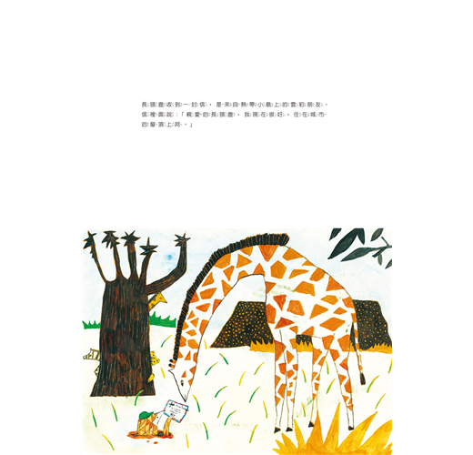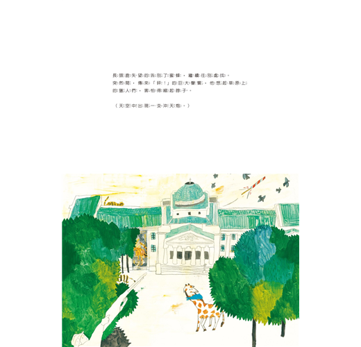 沿途所見,是專屬於臺灣城市的日常風景,各種樣貌的鐵皮屋頂和造型各異的水塔、鴿舍,以及高樓間揮舞的懸臂吊車……。在王春子的筆下,這些熟悉的都市角落都幻化成奇幻場景。每一頁圖像都細膩動人,讓讀者跟隨長頸鹿的目光,重新發現城市的獨特樣貌。