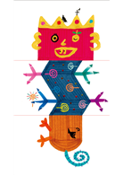 例如猜猜圖❾的造型叫什麼名字?很長很長喔:尾巴有兩個綠月亮的亮亮魚眼睛胖橘子三角蝴蝶灰灰花花斑馬五色棒棒糖四腳龍。算算看,總共有35 個字呢。厲害吧?! 要不要挑戰一下?你能拼和畫出名字更長的動物嗎?