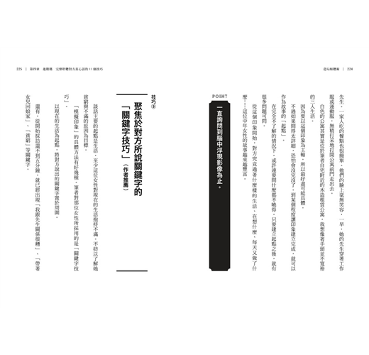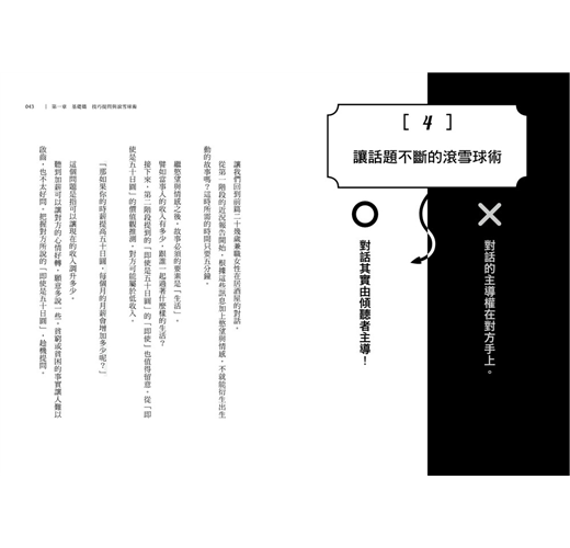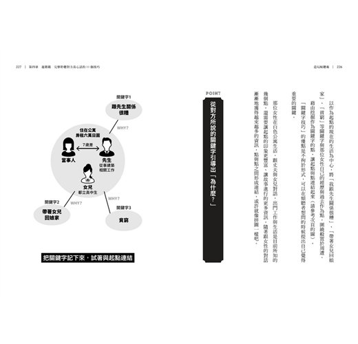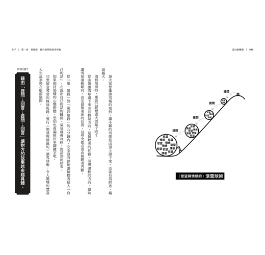 「滾雪球」、「推測問話」、「反假設問句」、「劇場型技巧」、「時光倒流法」……全書共44種技巧,就算只學會一項技巧也受用!