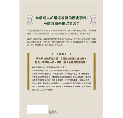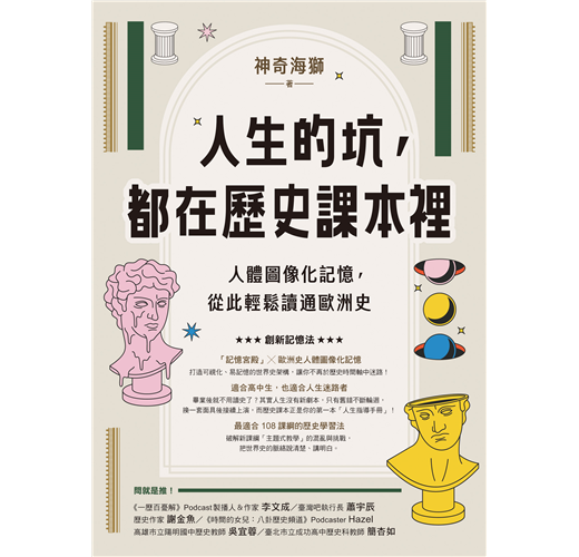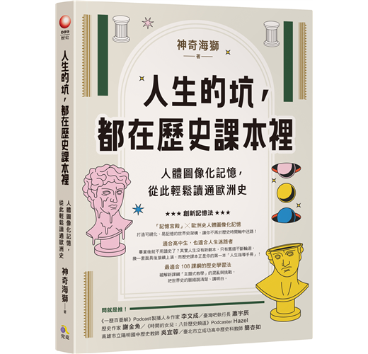 透過「記憶宮殿」這個連福爾摩斯都愛用的記憶法,參與過高中歷史課本編輯的人氣作家海獅,巧妙地將歐洲史比喻成人體,從頭到腳對應各個時代與轉折,用身體記歷史,既直觀又不容易忘!