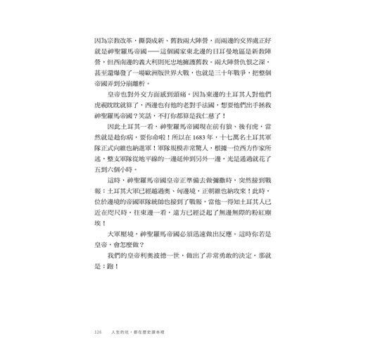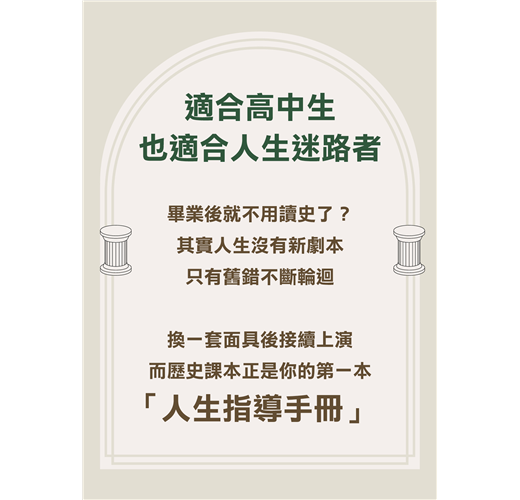 本書以歷史事件為骨架,揉以輕鬆詼諧的筆調與精闢的人性剖析,讓你明白歷史不只是背誦名詞,而是學會看穿「人性不變的劇本」:權力的誘惑、信仰的選擇、風險與利益的賭局……。你會發現歷史不是發生於過去的事情,而是一直在用不同的方式重演,若沒有學會看懂、體會、連結,很可能在你的人生中再次出現。