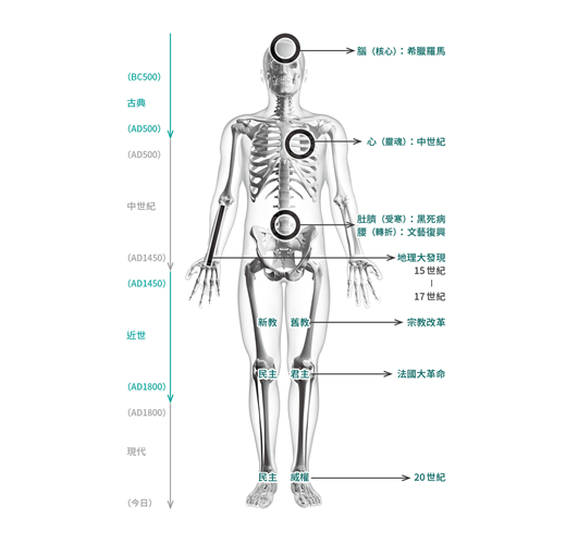 接著,我們將歷史課本歐洲史的每個時代,依次帶入這七個地方。我訝異地發現,這些時代竟然都跟身體的部位完美結合欸!例如: