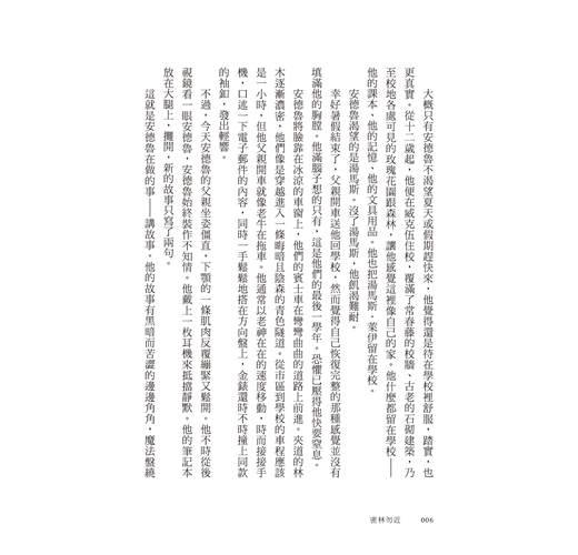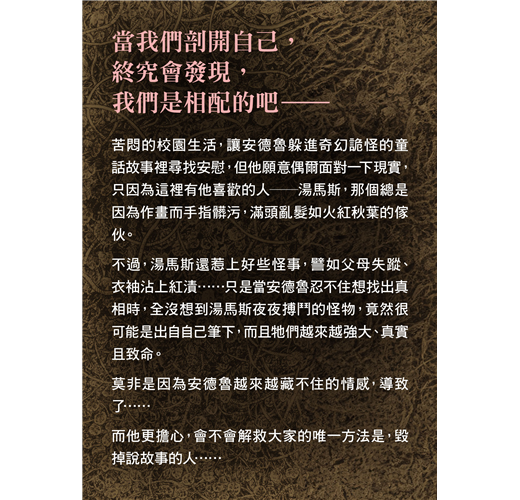 不過,湯馬斯還惹上好些怪事,譬如父母失蹤、衣袖沾上紅漬……只是當安德魯忍不住想找出真相時,全沒想到湯馬斯夜夜搏鬥的怪物,竟然很可能是出自自己筆下,而且牠們越來越強大、真實且致命。