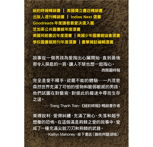 ※完全是愛不釋手,欲罷不能的體驗——一片茂密森然世界充滿了可怕的怪物和脆弱敏感的男孩,他們試圖在對藝術、對彼此的癡迷中尋找生存之途。──Trang Thanh Tran,《紐約時報》暢銷書作者