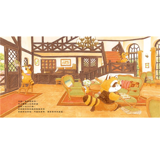 浣熊一家很愛乾淨。為了讓客人住得舒適,他們全家人合力打掃,把柔軟的抱枕擺得整整齊齊,飯店裡的地板、門窗和家具,總是亮晶晶。