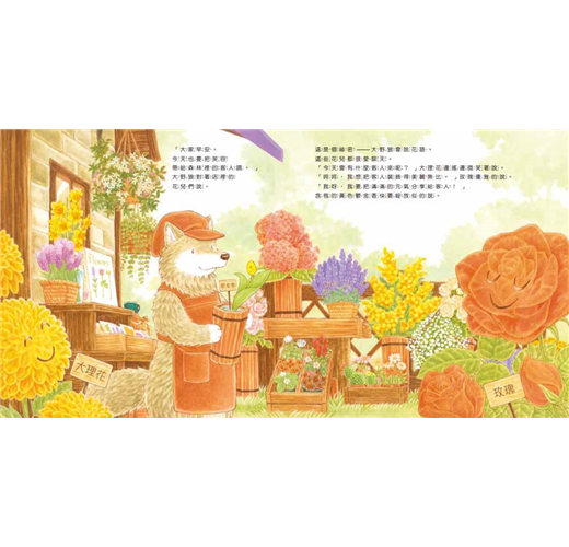 森林裡有一間大野狼開的花店,大野狼很懂得花語,每天都和花朵們一起把笑容帶給客人。森林裡的動物們都會來買他們喜歡的花。